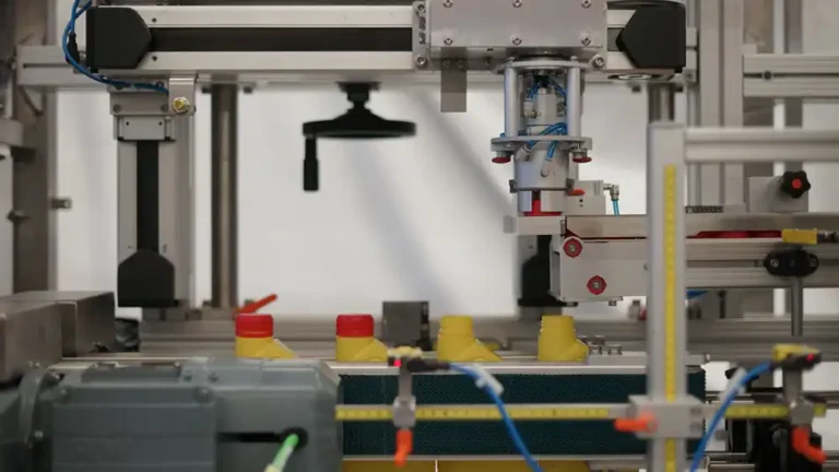 The container enters the machine on the conveyor belt. Inside the machine the container is stabilized and guided by two side belts. Caps are oriented in vertical caps feeder/orientator or in rotary caps orientator.