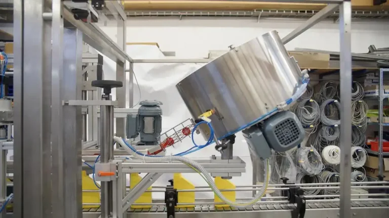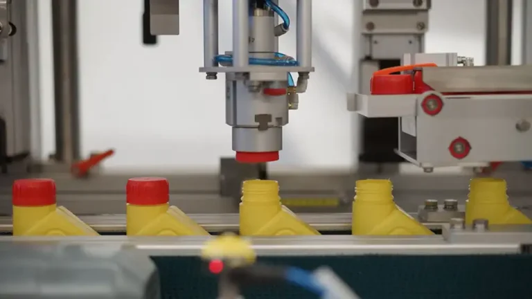 Oriented caps pass through the caps chute to the pickup point, where they are taken by dynamic servodriven capping head. The capping head follows the movement of the containers and tightens the caps on requested torque during the container transport. Closed bottles leave the machine on downstream conveyor.